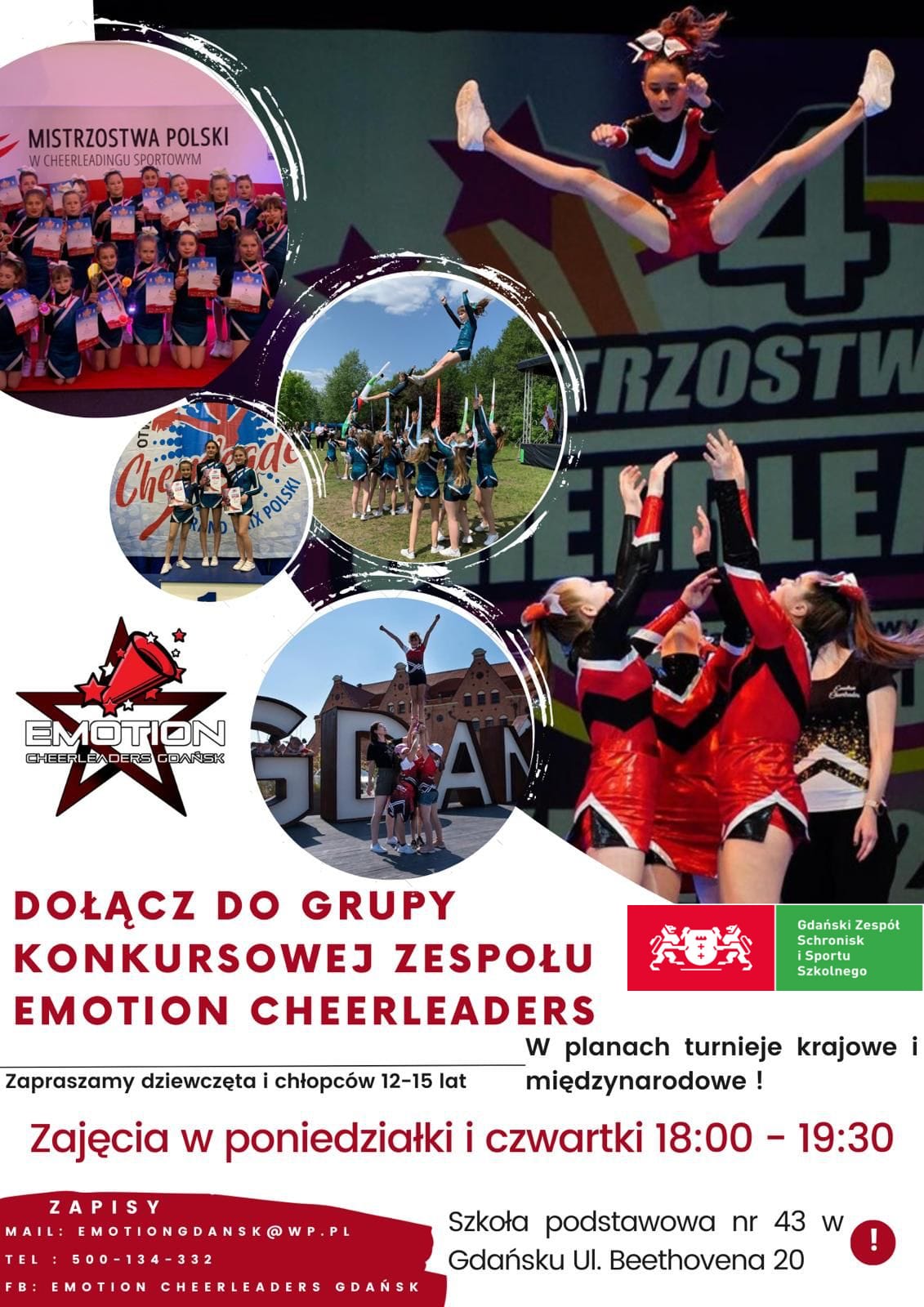 Sekcja sportowa Emotion Cheerleaders Gdańsk zaprasza dzieci w wieku 12 – 14 lat na zajęcia cheerleaderingu. Zaproszenie do uczestnictwa w zajęciach grupy sportowej cheerleaders kierowane jest zarówno do dziewcząt jak i chłopców.